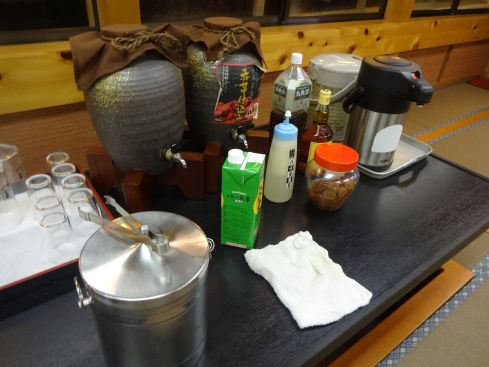 | ドリンクコーナー お茶 ウーロン茶 焼酎などのセット ビールやジュースは冷蔵庫の中に入っていて 自由に好きなだけ飲むことができます |