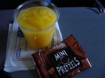 アメリカでは国内線でも ジュースと簡単なお菓子がでます