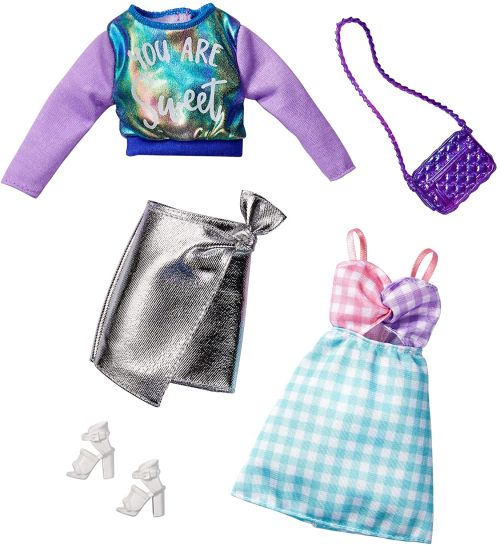 GHX62 Barbie Fashions 2-Pack Clothing &Accessories Set Includes Sweatshirt, Silvery Metallic Skirt, Gingham Dress バービーファッション2パックシルバーパステル ¥1500+税 ¥1650