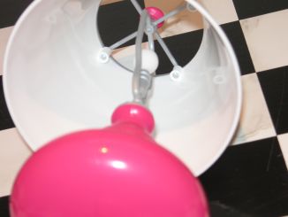 サイドテーブル、ランプ、ファンキーな壺、トレイ、バービーシルエットの鏡は全て白、黒、ピンクで統一