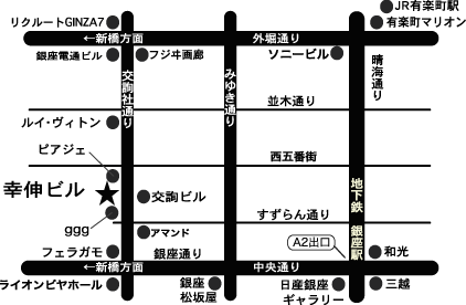 東京メトロ銀座駅A2出口を出て、中央通り沿いをまっすぐ行って頂き、フェラガモを右折し、