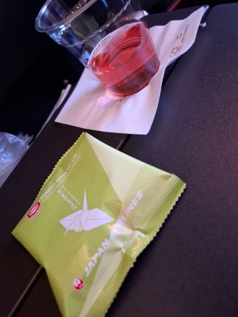 乗ってすぐで ジュースとプレッツェルが提供されますが