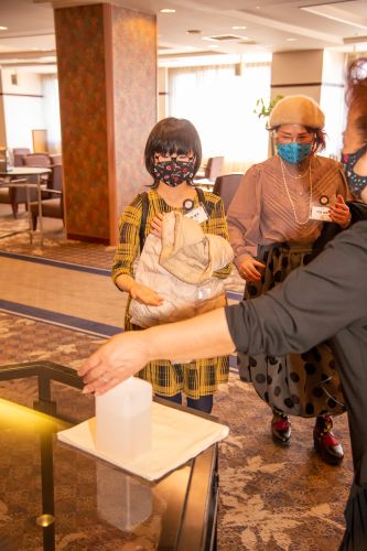 皆さんが自分でテーブルの物を取っていくという 非接触受付けにいたしました。